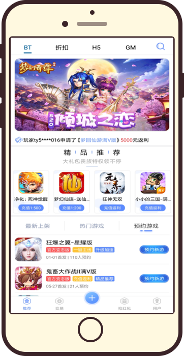 【折扣游戏平台】为热衷手机游戏用户量身定制的手游盒子APP,汇聚全网BT手游、变态手游、折扣手游、GM游戏,上线送满级VIP,无限元宝,变态爆率,GM特权,BT游戏。还可享受无限刷元宝、任意转区等特权。